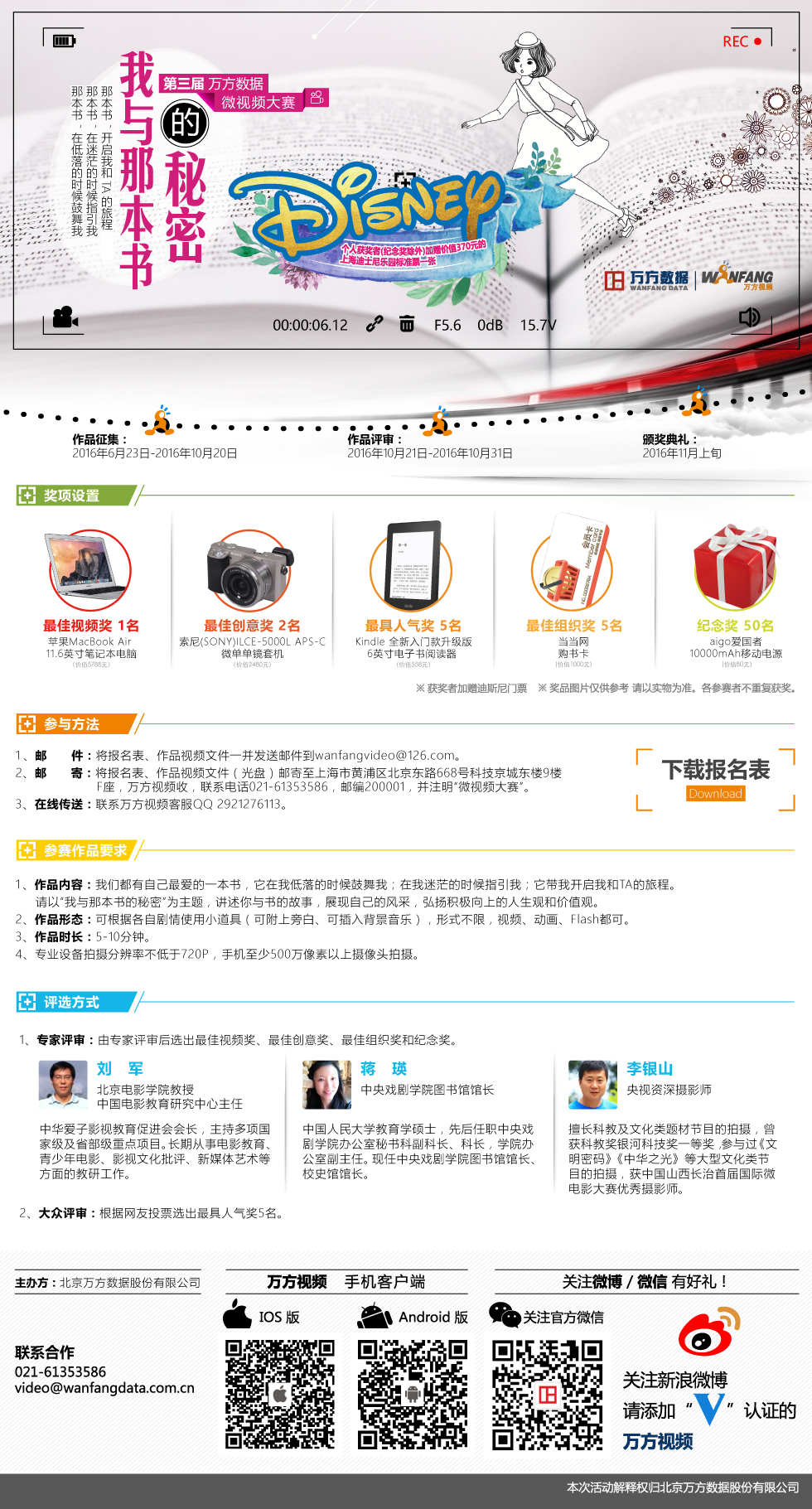 2、邮寄:将报名表、作品视频文件(光盘)邮寄至上海市黄浦区北京东路668号科技京城东楼9楼F座,万方视频收,联系电话021-61353586,邮编200001,并注明“微视频大赛”。