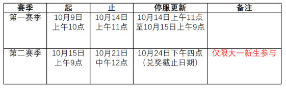 第二赛季(仅限大一新生):2019年10月15日 9:00AM至10月21日 12:00AM