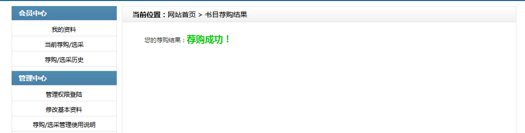 荐购完成后,定期由图书馆采编人员登陆网站管理权限,下载读者及各院部老师为图书馆推荐的书目,经审核后生成订单统一采购,同时将处理结果实时反馈读者及各院部老师。