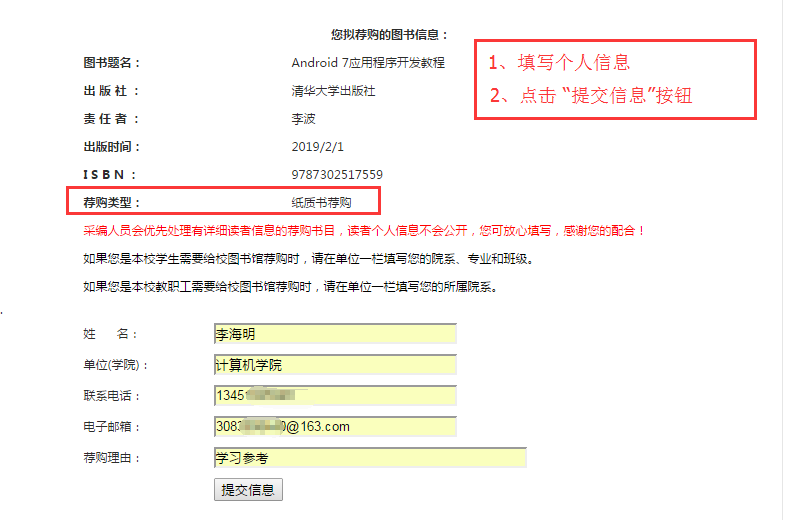 填写个人信息后,点击提交按钮即可将荐购的图书推荐给图书馆。如下图: