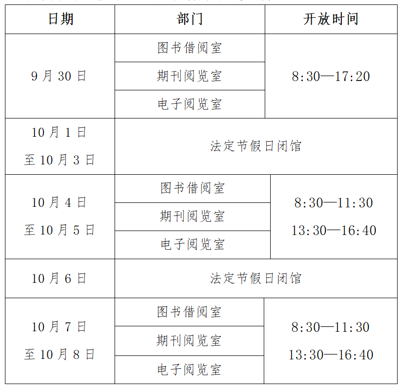 根据学校《关于2025年国庆节、中秋节放假调休安排的通知》,图书馆国庆节、中秋节期间开馆安排如下: