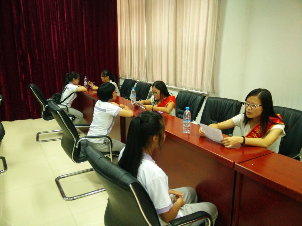 9月1日,既是新生军训开始的第一天,也是图书馆志愿者纳新的第一天。距离正式面试时间还有15分钟的时候,门口就排起了长队,很多同学军训刚结束顾不上吃饭就匆匆赶来面试了。与往年不同的是,今年的面试官都是2015级志愿者同学。她们个个身披红色绶带,英姿飒爽,严肃认真地审视着每一名面试同学。每晚两小时的面试只进行了三天,就已经录满。据统计,本次纳新共有313名同学参加面试,251名同学被录用。