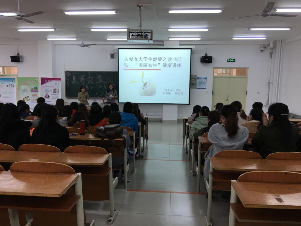 3月30日下午,图书馆与校医院联合举办的“关爱女大学生健康之读书活动——“美丽女生”健康知识讲座”在博文楼108举行,各院系女生及女教师约60人到场聆听。讲座由校医院副院长苗天爱主讲,图书馆副馆长宋军风主持。