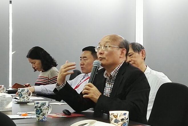 随后,交流团成员与逢甲大学图书馆馆长林志敏、东海大学图书馆前馆长陈格理馆长、逢甲大学图书馆助理馆长王慧娟进行了座谈。林志敏馆长从馆舍建筑、组织概况、创新服务、推广策略与活动等方面介绍了逢甲大学图书馆的基本情况及逢甲大学数位学习发展历程,强调持续强化图书馆的传统功能角色,同时实现从“藏经阁”到“学习中心”到“学习工场”的蜕变。