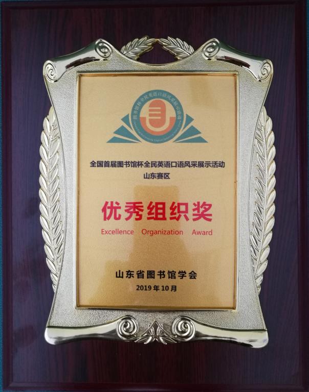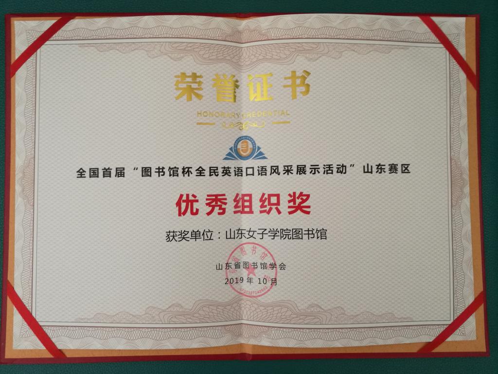 2019年10月,山东女子学院图书馆在全国首届图书馆杯英语口语风采展示活动中获得山东赛区优秀组织奖。