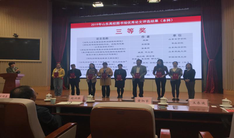 为激励全省图书馆馆员的学术创新,提升全省高校图书馆的服务能力,本次会议面向全省高校图书馆开展优秀学术论文征集评选活动。在会议颁奖环节,山大大学图书馆副馆长程蓓宣读获奖者名单。我馆馆员庞璐提交的《当代大学生儒家经典阅读现状研究》获得本科组三等奖。