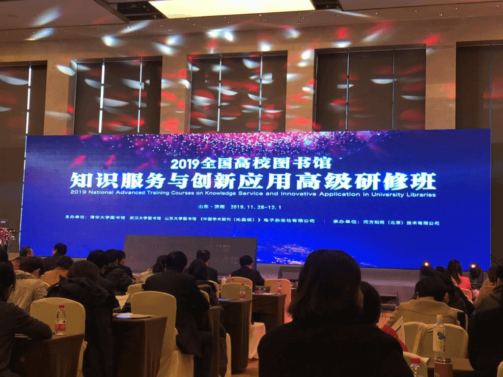 11月29日,2019高校图书馆知识服务与创新应用高级研修班在济南成功举办。此次研修班由清华大学图书馆、武汉大学图书馆、山东大学图书馆、《中国学术期刊(光盘版)》电子杂志社有限公司共同主办,同方知网(北京)技术有限公司承办。我馆开滨和张黎两位老师与来自全国高校图情界和管理机构的700余位专家学者及参会代表,围绕“双一流”背景下数字图书馆理论与实践、图书馆资源建设、大数据与科研创新服务等主题进行了热烈探讨。