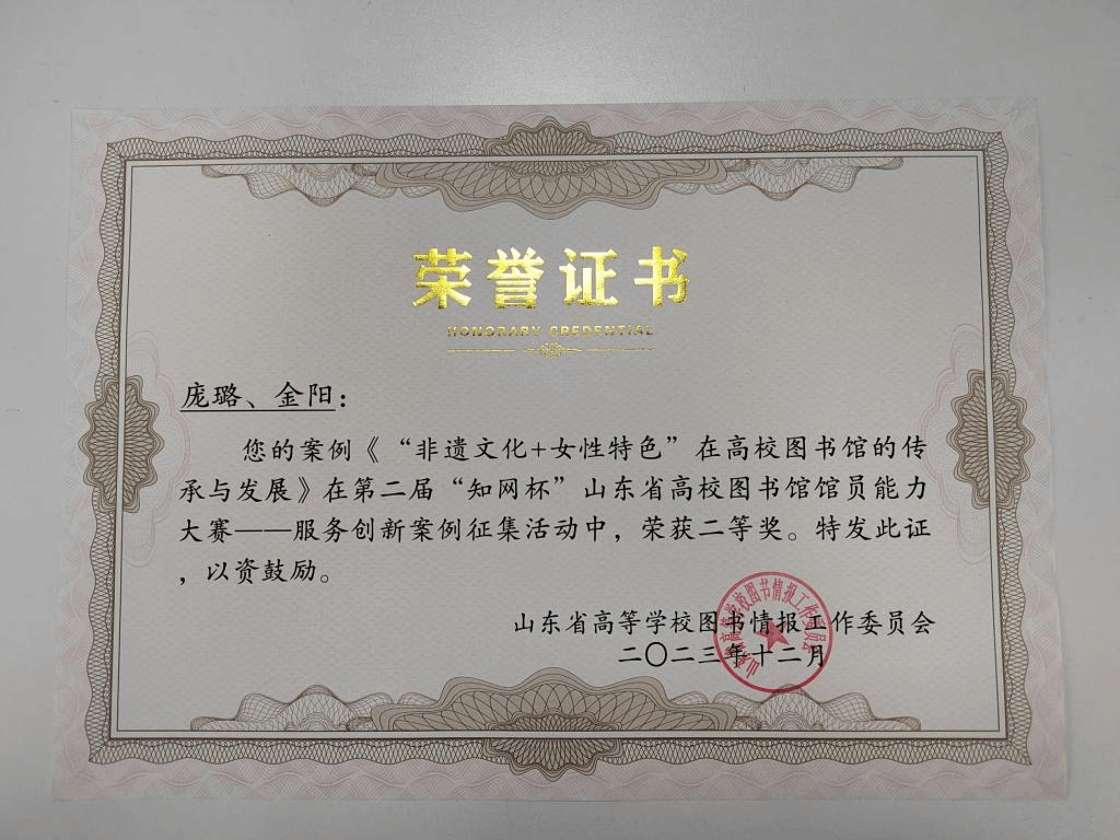 近日,在青岛大学举办的第二届“知网杯”山东省高校图书馆馆员能力大赛中,图书馆申报的《“非遗文化+女性特色”在高校图书馆的传承和发展》案例成功晋级决赛,荣获二等奖。申报的《山东女子学院图书馆“RED学科服务 ”案例》荣获三等奖。