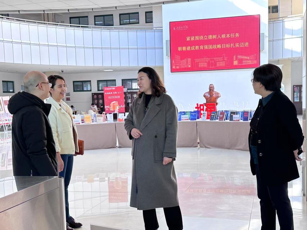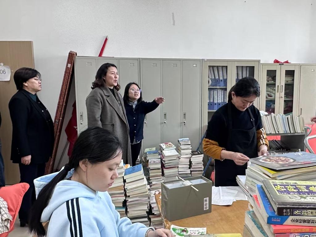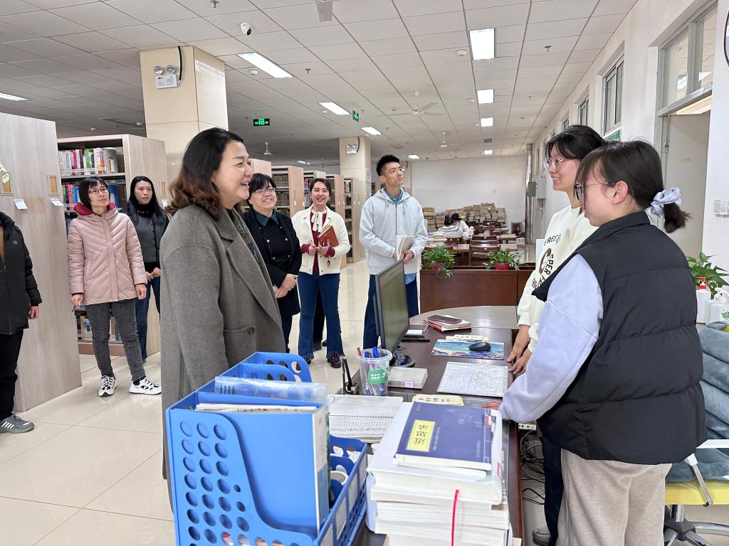 随后,李缨深入采编部详细了解图书捐赠的工作进展,并听取了图书馆的情况汇报。成曙霞汇报了图书馆在资源建设与特色服务、空间改造与服务师生、阅读推广与文化育人以及社会合作、学科服务等方面的工作进展,分析了存在的问题和下一步改进措施。李缨对图书馆的工作给予充分肯定,详细询问图书馆特色服务和空间改造情况。她指出,图书馆的资源建设为学科建设提供了有力支持;阅读推广活动和空间改造升级,为学生提供了良好的学习环境。下一步要进一步和学校中心工作结合,和各二级学院深化合作,拓展服务维度、深化服务内涵。她也提到,图书馆目前存在如信息化数字化建设滞后、复合型人才短缺等问题,要求大家要开阔格局,不断学习、充电,成为领域内的专家;同时也要快乐工作,以服务师生需求为牵引,充分挖掘和利用资源,为师生提供更优质的服务。