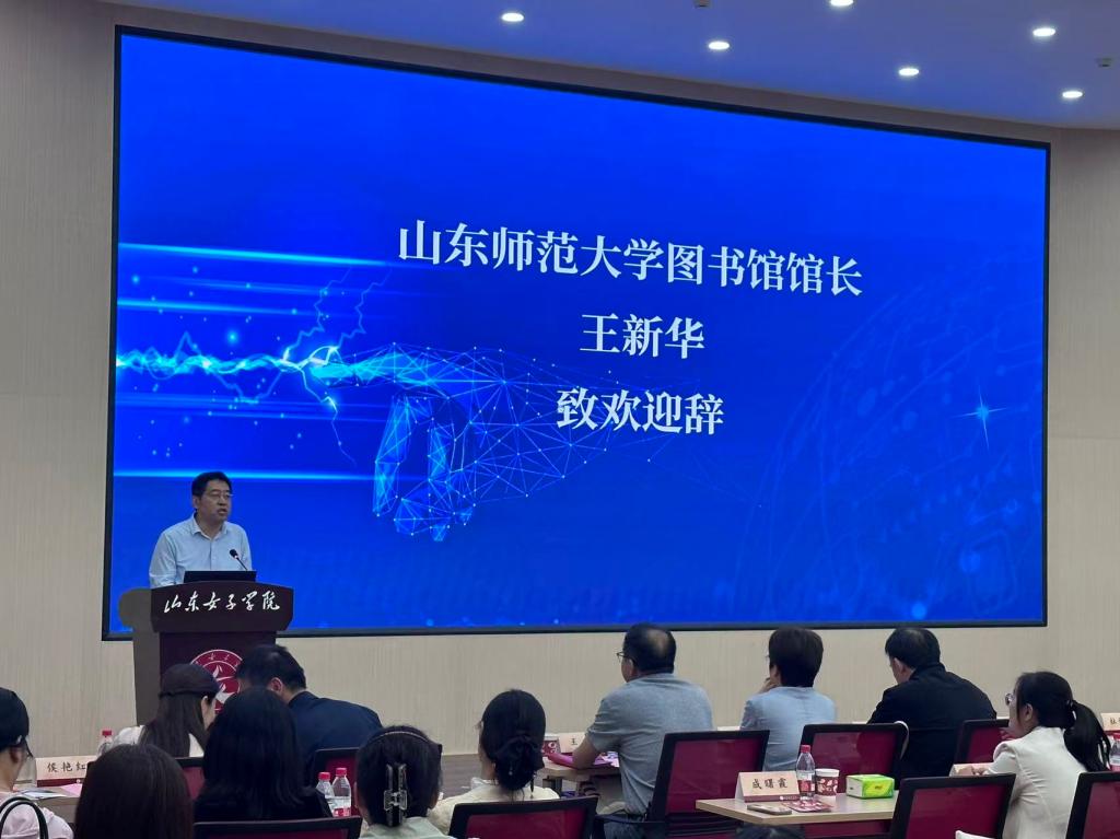 山东师范大学图书馆馆长王新华代表长清大学城高校图书馆联盟致辞。他在肯定联盟成立以来既往成绩的同时,指出当前图书馆事业正面临深刻变革。他强调各联盟成员馆应聚势赋能,以开放协作的姿态共迎新技术、新思想,通过深度研讨汇智聚力,共谋创新发展路径,以期开创长清大学城高校图书馆服务的新局面。在随后《智慧赋能知析未来:图书馆学科情报服务的实践与思考》的报告中他对图书馆学科服务的体系设计和自身转型发方向进行了思考,并通过一系列服务案例,提出数据赋能的理念已成为图书馆实现精准服务与科学管理的重要基础,通过构建数据中台、开展多维度数据分析,能够有效支撑学科评估、资源建设与智慧决策,为图书馆服务升级注入持续动能。